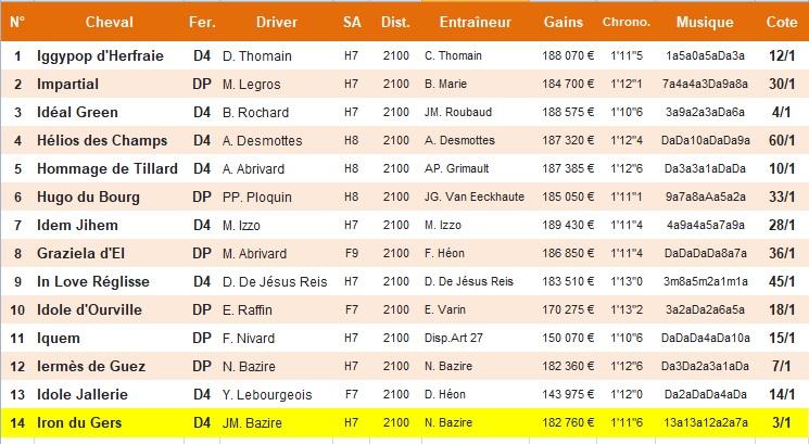 | < | > | Barbara: 20h15 | Paris-Vincennes - R1C5 | Trot | 14 | 9 | 2100 | |